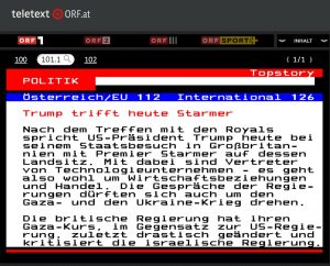 Zitat: US-Präsident Donald Trump ist gestern zum offiziellen Auftakt seines zweiten Staatsbesuchs in Großbritannien von der britischen Königsfamilie auf Schloss Windsor empfangen worden. ... Beim abendlichen Staatsbankett würdigte König Charles Trumps „persönliches Engagement“ für den Frieden.