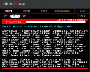 Zitat: Israels Finanzminister Bezalel Smotrich sieht den Gazastreifen als potenzielle "Immobilien-Goldgrube". "Es gibt einen Geschäftsplan, der von den professionellsten Leuten ausgearbeitet wurde, der auf dem Tisch von US-Präsident Trump liegt", sagte der rechtsextreme Minister bei einer Immobilienkonferenz in Tel Aviv, wo er auch nach der Zeit nach dem Gaza-Krieg gefragt wurde. Er habe in der Frage Verhandlungen mit den Amerikanern aufgenommen. Es gehe darum, "wie diese Sache eine Immobilien-Goldgrube wird", die Israels Unkosten abdecken werde, so der als fundamental-religiös geltende Smotrich.